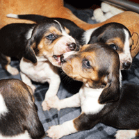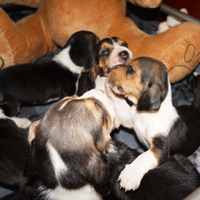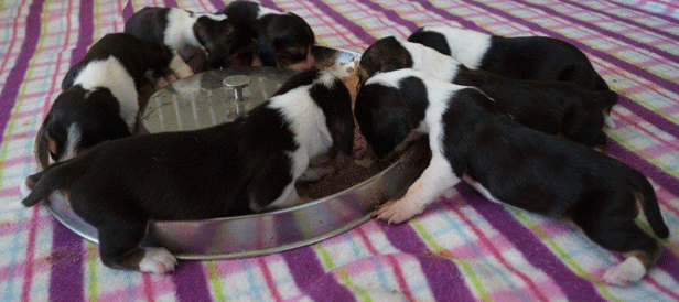 De puppy's gaan steeds meer kruipen op zoek naar nieuwe geurtjes.