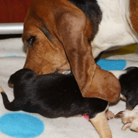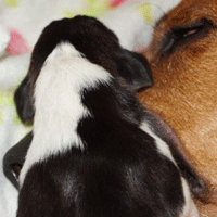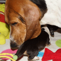 en de pups daarna weer schoon te likken.