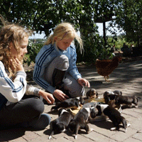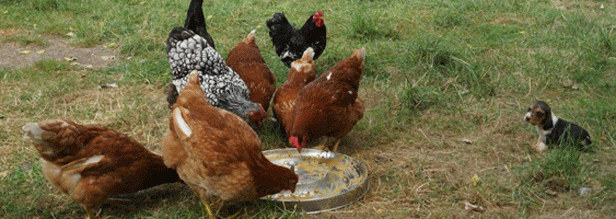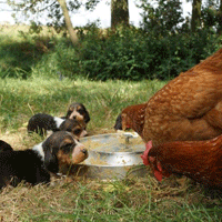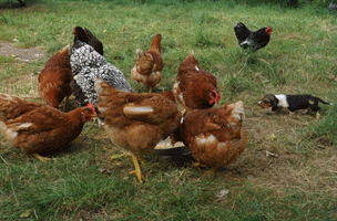 Vandaag kwamen de kippen gezellig mee eten, de pups wennen op deze manier mooi aan de kippen.
