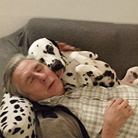 Haar liefste slaapplek, op haar rug koppie tegen het baasje aan.