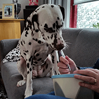 Angel zit graag aan tafel als wij klaar zijn met eten.