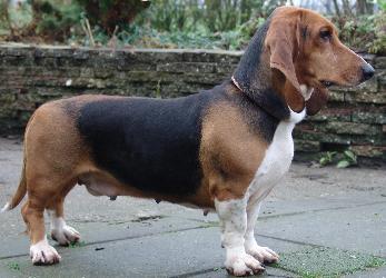 een Basset, gedrongen, de dij goed gerond, de staart nogal kort en borstelig.